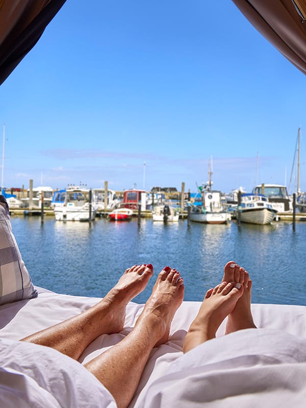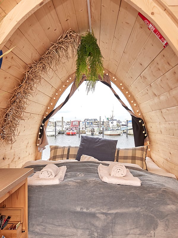 Dette Boathouse er en otte kvadratmeter hytte bygget på et flydende soldæk, der tilbyder komfort og hygge til op til fire personer. Hytten er placeret på en 24 m2 flydebro, som fungerer som din helt egen terrasse, her findes liggestole til at nyde havudsigten.